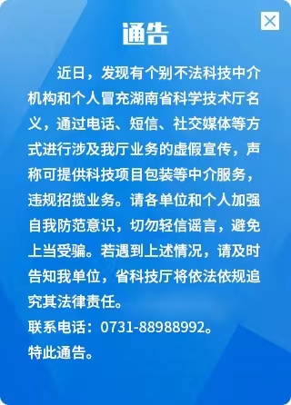 - 06/03 湖南省科學(xué)技術(shù)廳 湖南省財(cái)政廳關(guān)于開展湖南省示范性科技成果轉(zhuǎn)化項(xiàng)目申報(bào)工作的通知(公示結(jié)束)